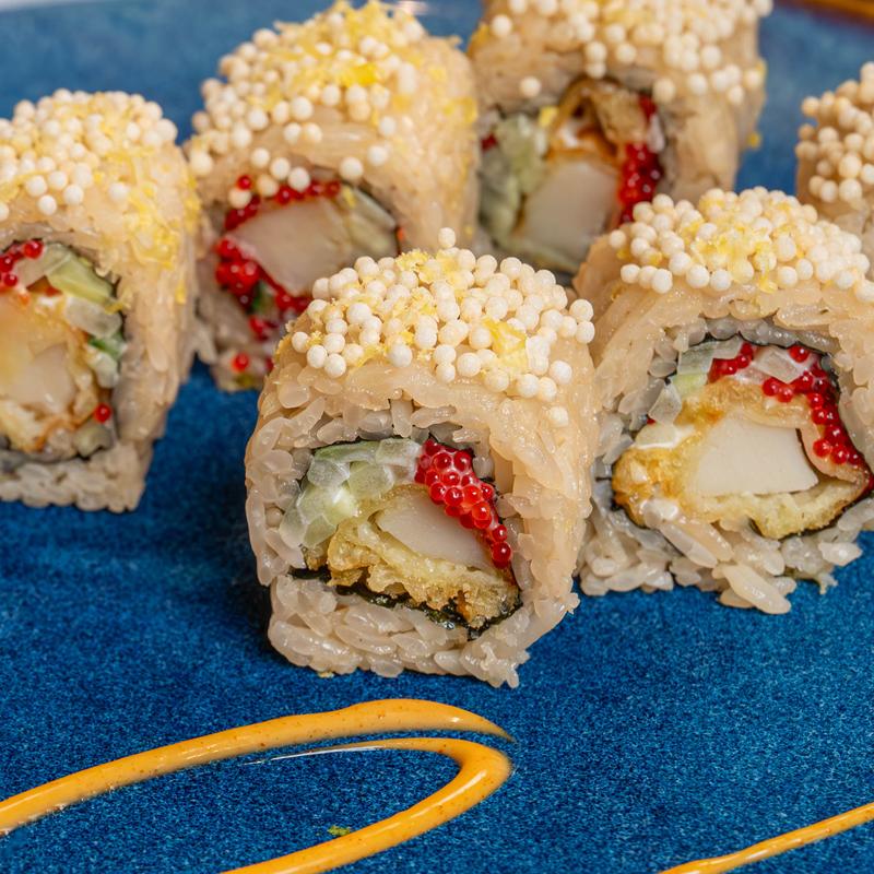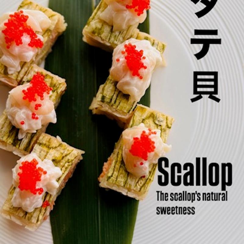 Negi Bluefin Tuna, Avocado, Crunch, Tobiko, Mayo, Konbu Nori, Top with chopped Scallops